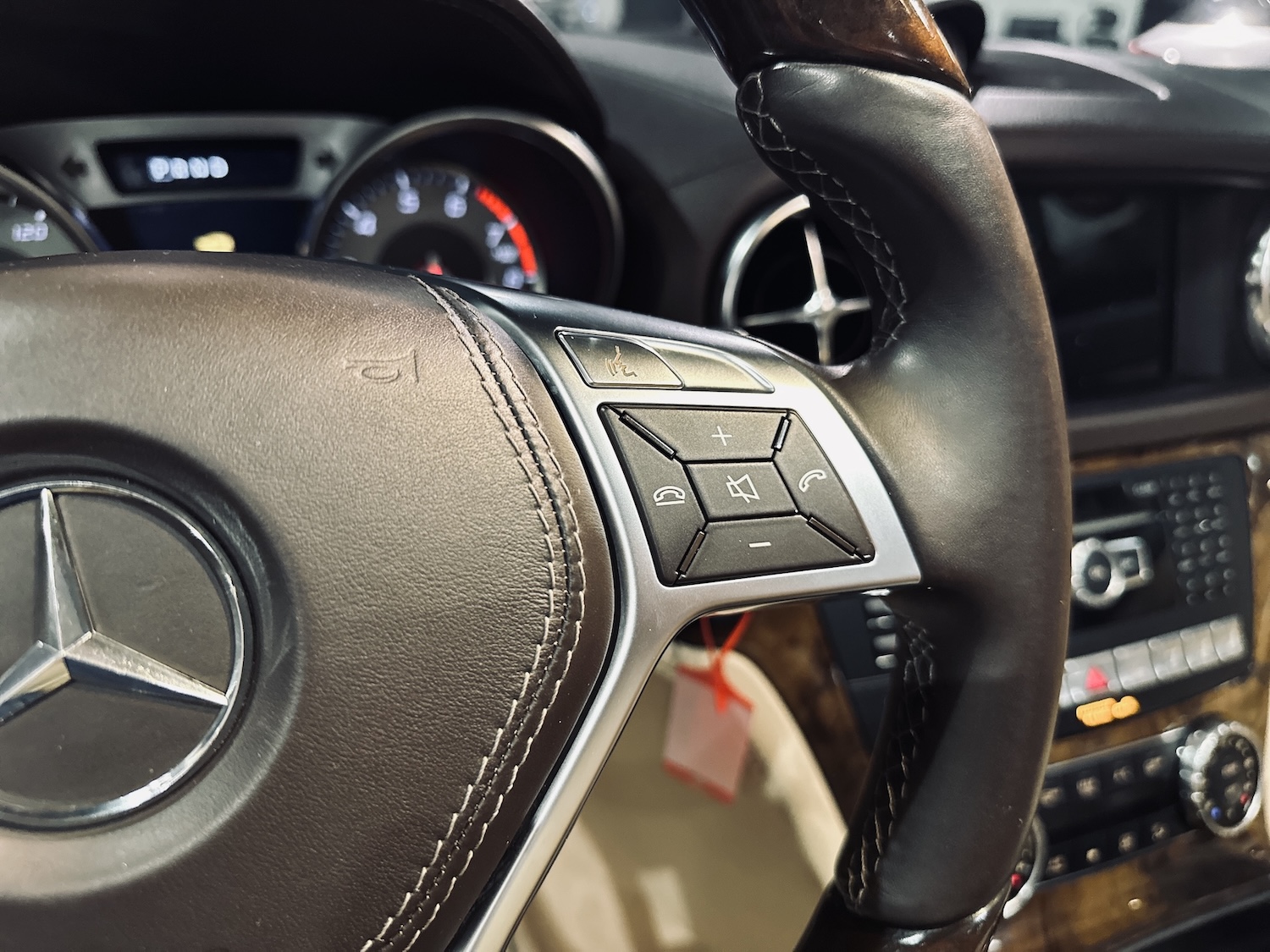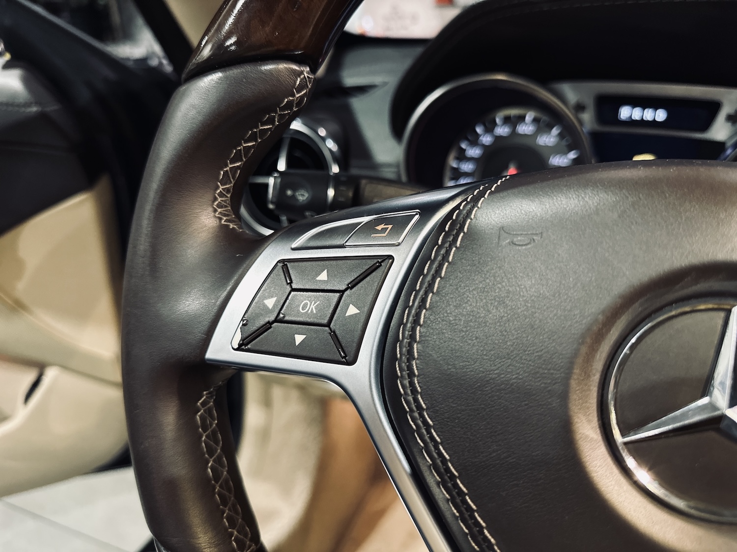 - Kierownica sportowa (ze ściętym wieńcem), multimedialna, obsyzta skórą i wykończona drewnem