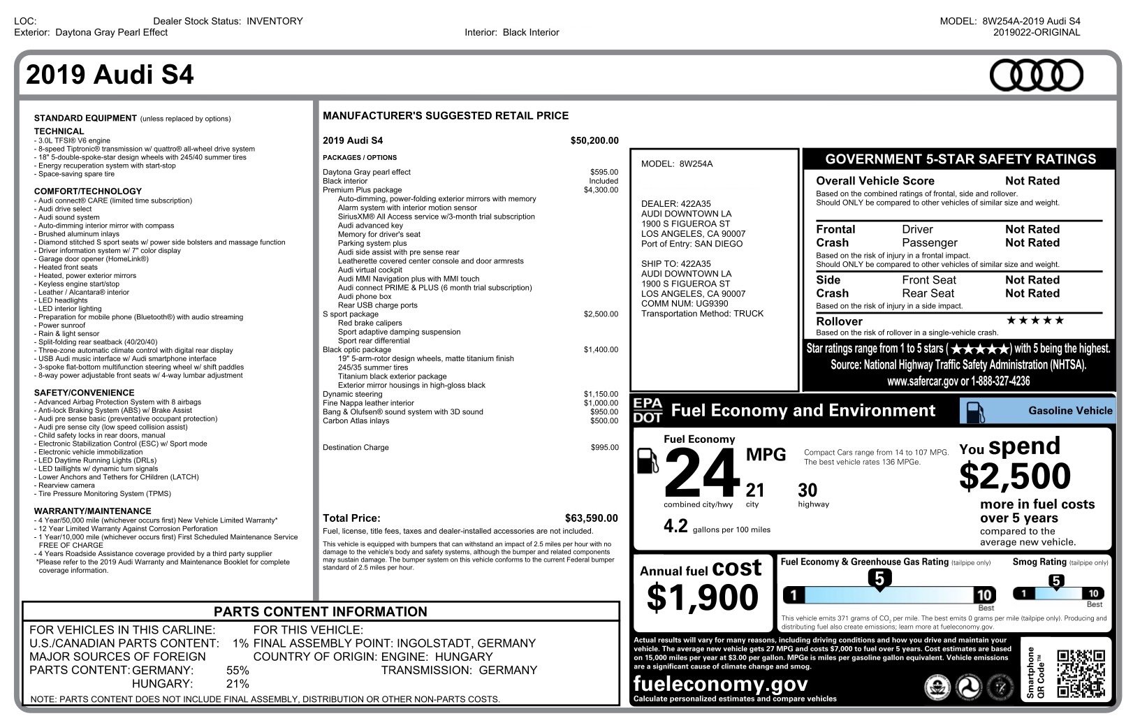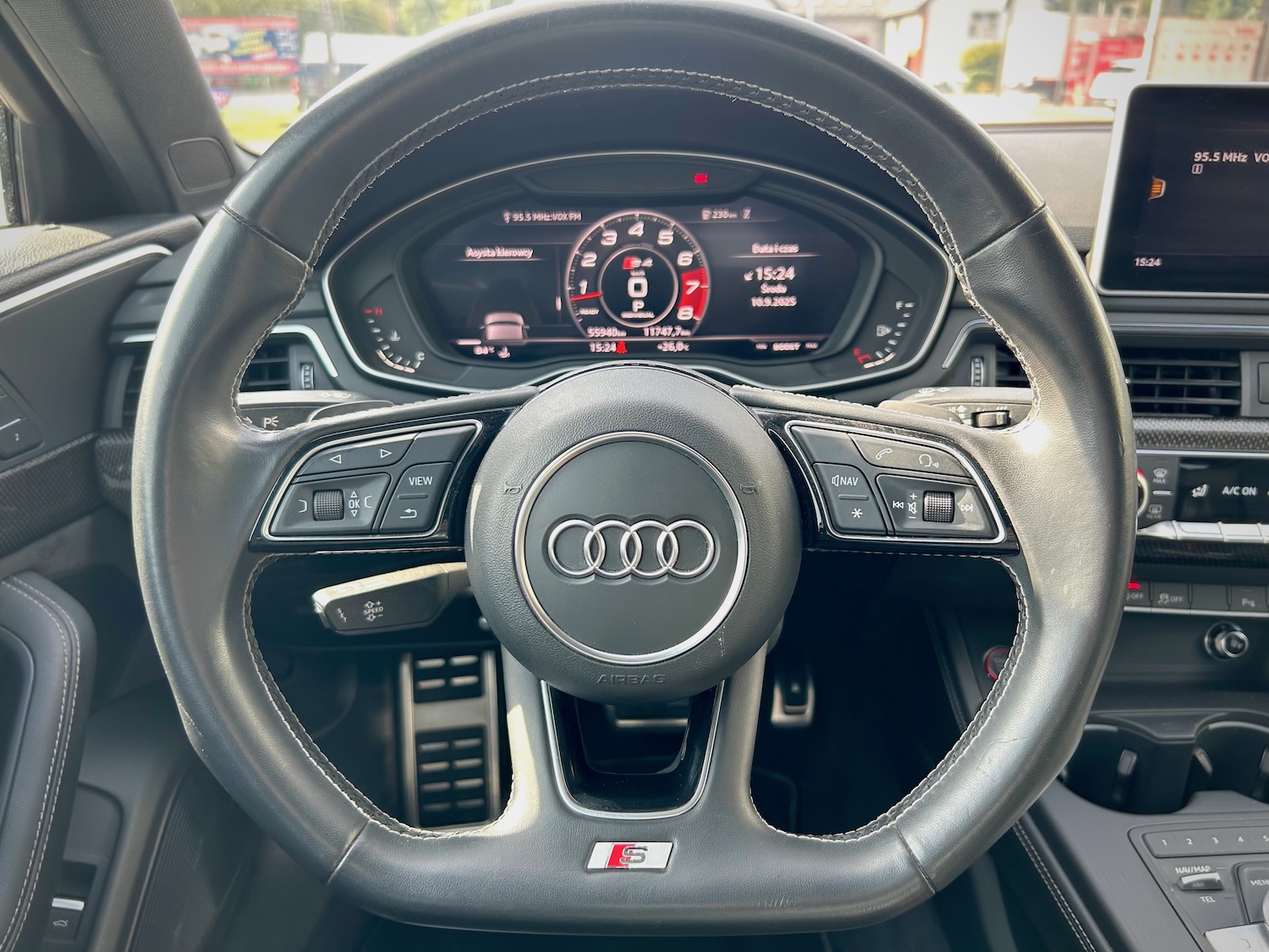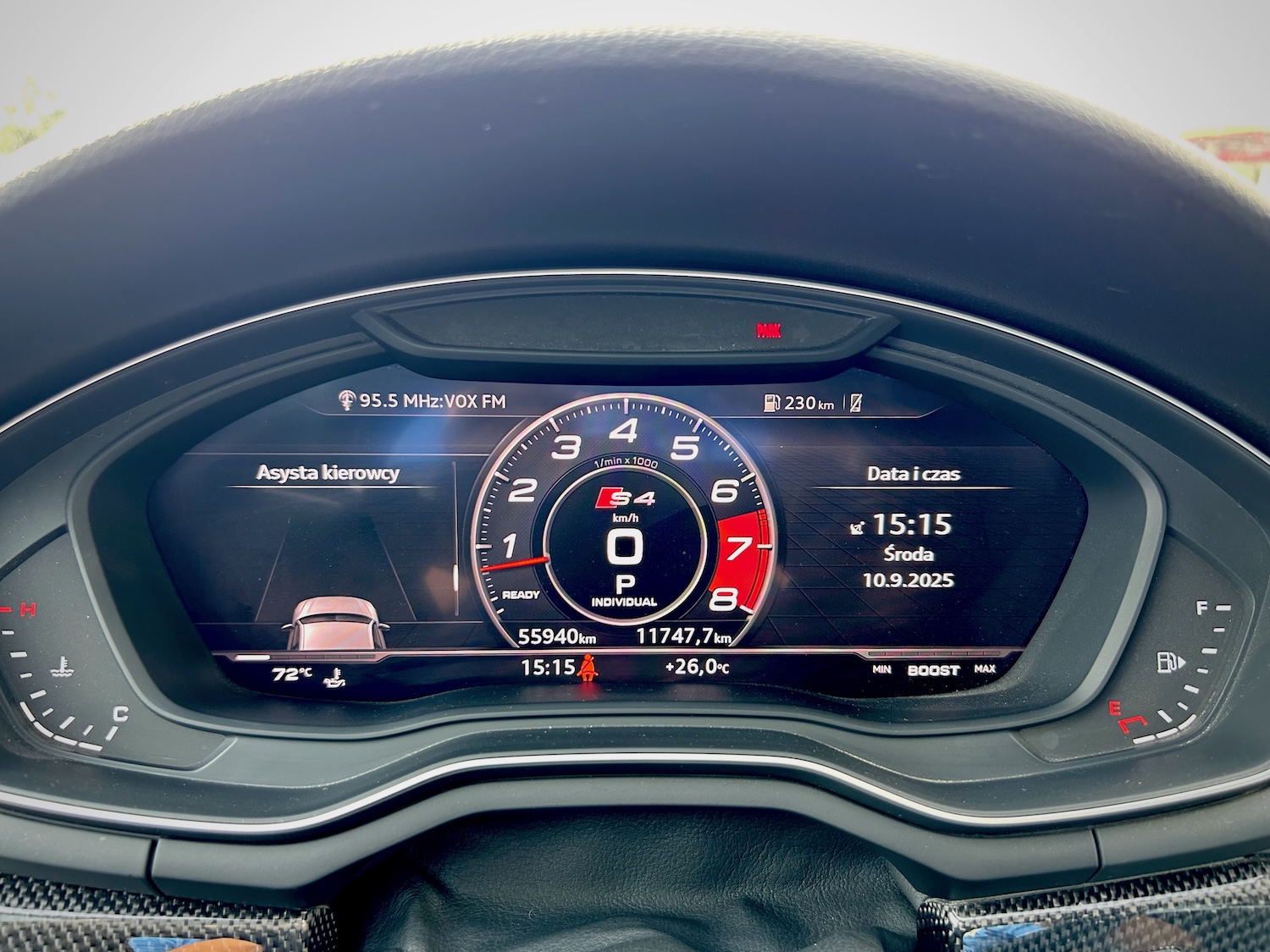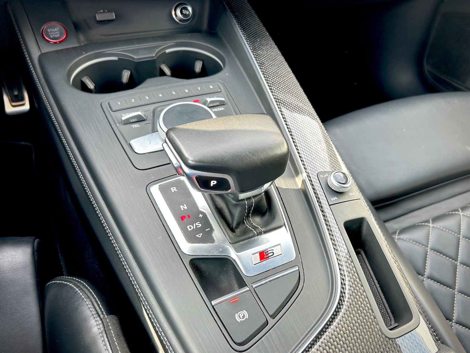 Nasz egzemplarz S4 to bogato skonfigurowana wersja Premium Plus z pakietami S Sport (m.in. szpera!) czy Black Optic (wyczernione akcenty nadwozia) oraz szeregiem pojedynczych opcji „stand alone” (m.in. dodatki karbonowe wnętrza, nagłośnienie B&O, dynamiczny układ kierowniczy)!