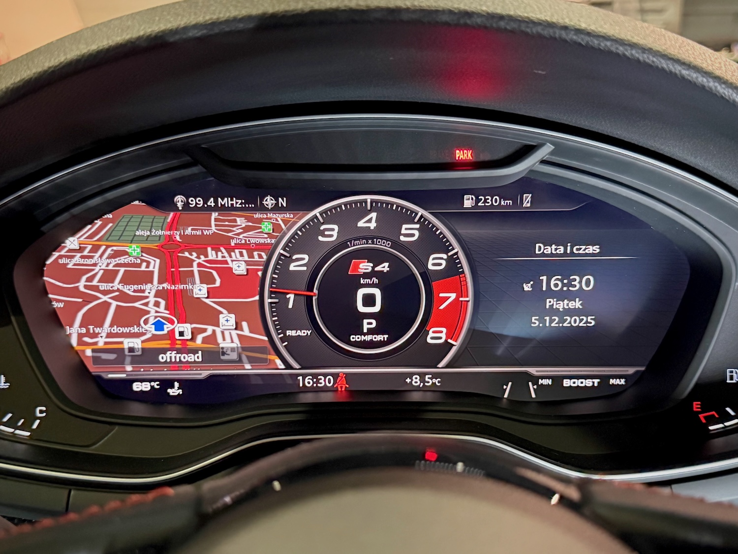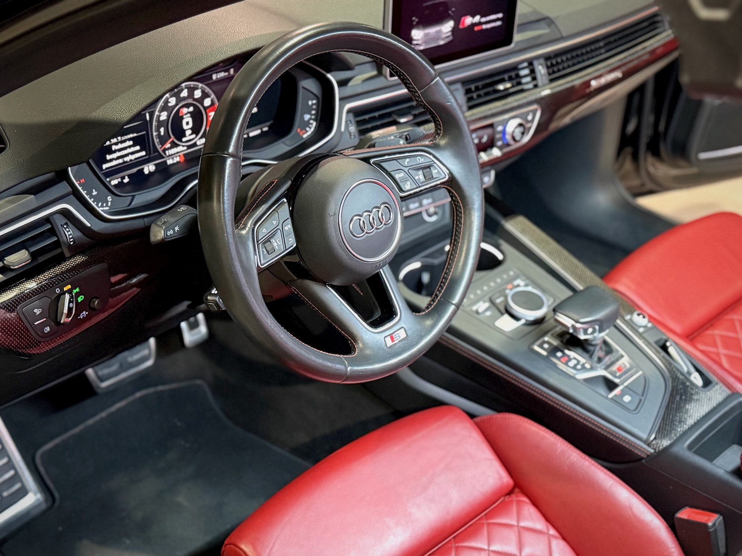 Bogata specyfikacja auta obejmuje m.in. cyfrowe zegary 12.3 cala, reflektory Full LED z Audi Beam, multimedia MMI z nagłośnieniem Bang & Olufsen 3D, karbonowe wykończenie deski rozdzielczej, trzystrefową klimatyzację, szyberdach…