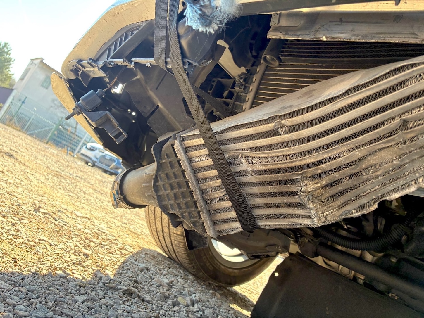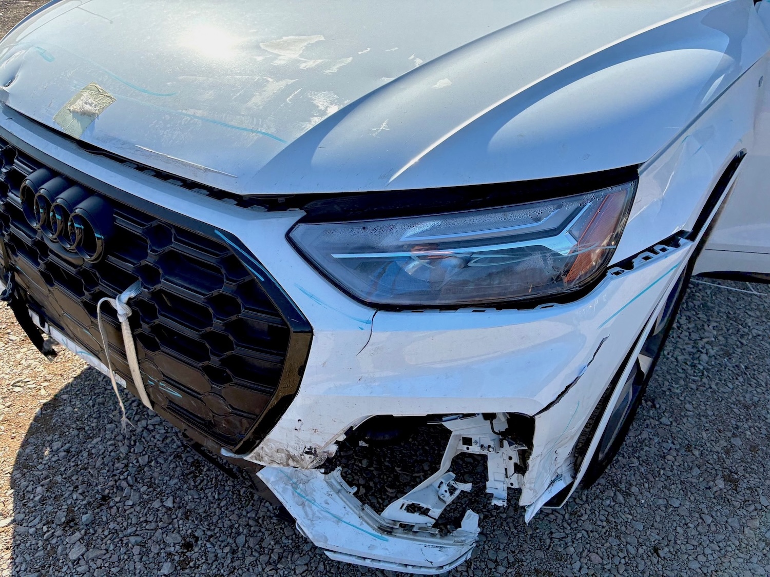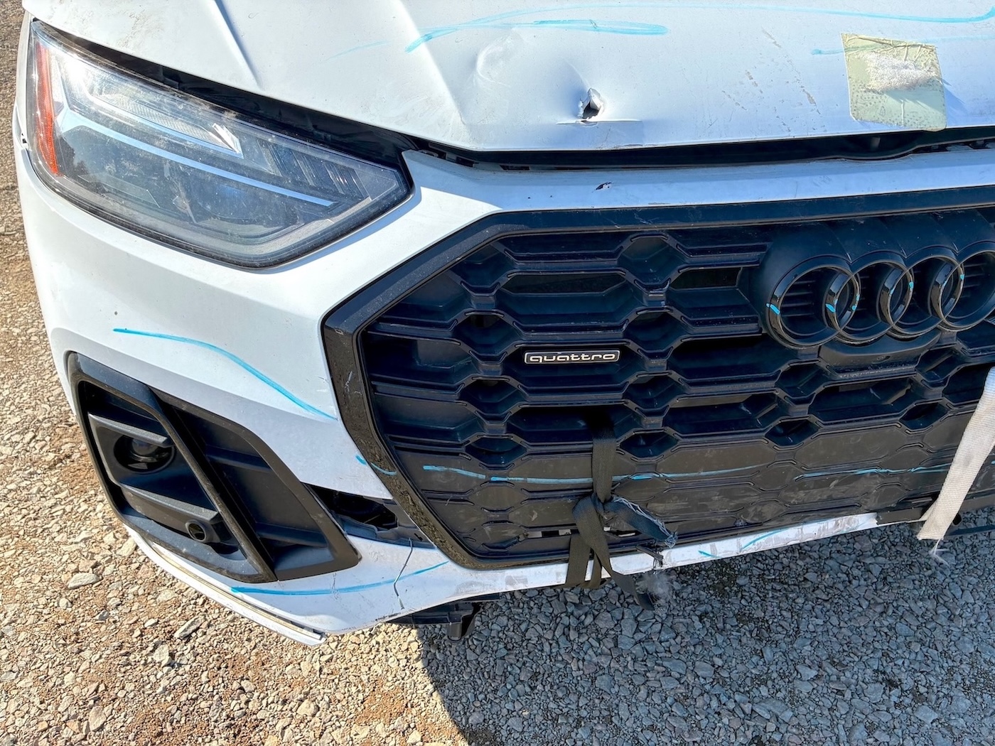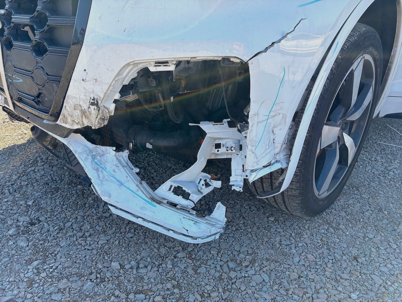 Auto ma nieznacznie uszkodzony lewy przód (w tym chłodnica oleju / wg. CARFAX szkoda lżejsza niż Moderate – średnia), ale też odpala i jeździ (Run & Drive) a maska tylna jest podgięta na rancie (do naprawy)